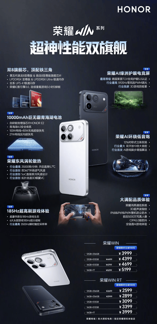 除了性能▲◁、续航与散热…☆…,荣耀WIN系列在屏幕、音频与通信等外围配置上同样诚意十足★◇。全系185Hz超高刷电竞屏,配合十三大护眼技术◇,为长时间游戏提供了舒适保障;荣耀AI环绕低音炮与双1216对称扬声器,进一步强化沉浸感□◆;IP68/IP69/IP69K满级防尘防水▽△◇、鸿燕通信系统以及3D超声波指纹◆△…,也让其在可靠性与实用性层面全面领先◆。