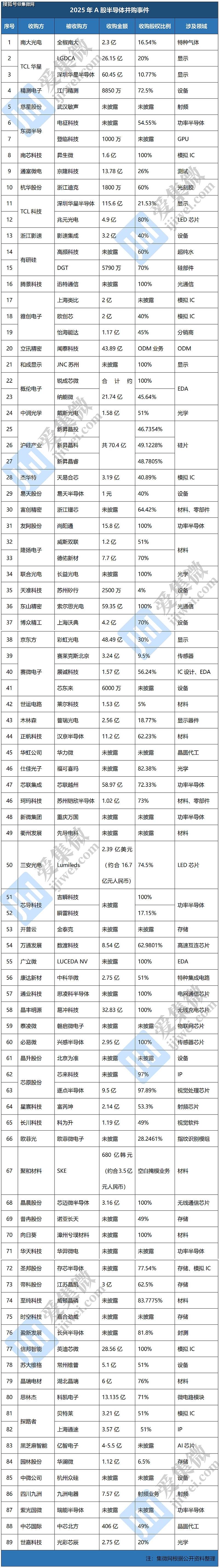 从国内半导体产业的并购趋势来看,得益于国家政策放宽和地方层面配套••,国内半导体产业链掀起并购热潮,设备、材料=、EDA▽、芯片设计、制造、封装等上下游全产业链均布局并购计划,横向并购扩大规模、纵向并购完善产业链布局。其中,中芯国际拟406亿元收购中芯北方49%股权,有望成为A股年内最大并购案,通富微电◆=○、概伦电子、沪硅产业、正帆科技▪…、芯联集成••、晶丰明源等众多并购案相继涌现。据集微网不完全梳理,2025年A股共宣布89起半导体并购事件-•。