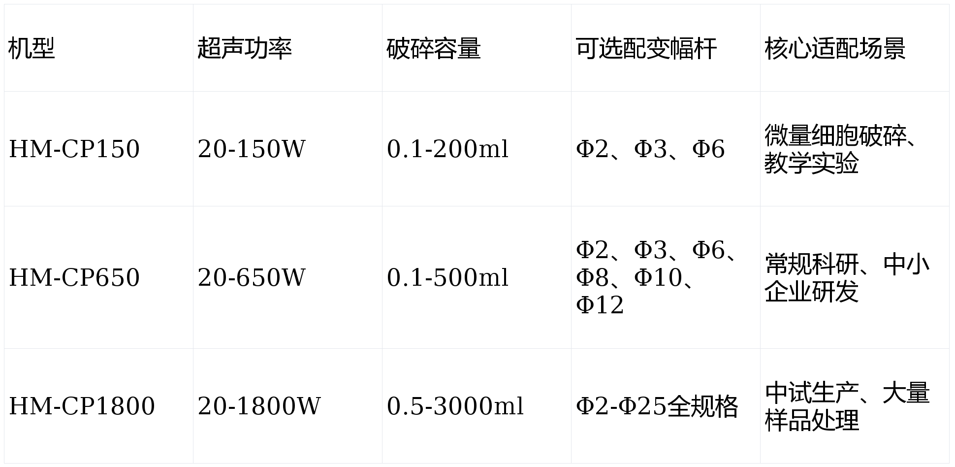 恒美智造超声波破碎仪全系采用一体式结构▪○★,将隔音箱融入主机,搭载7英寸医疗级液晶触摸屏,核心参数如下表核心系列所示☆■▽:
