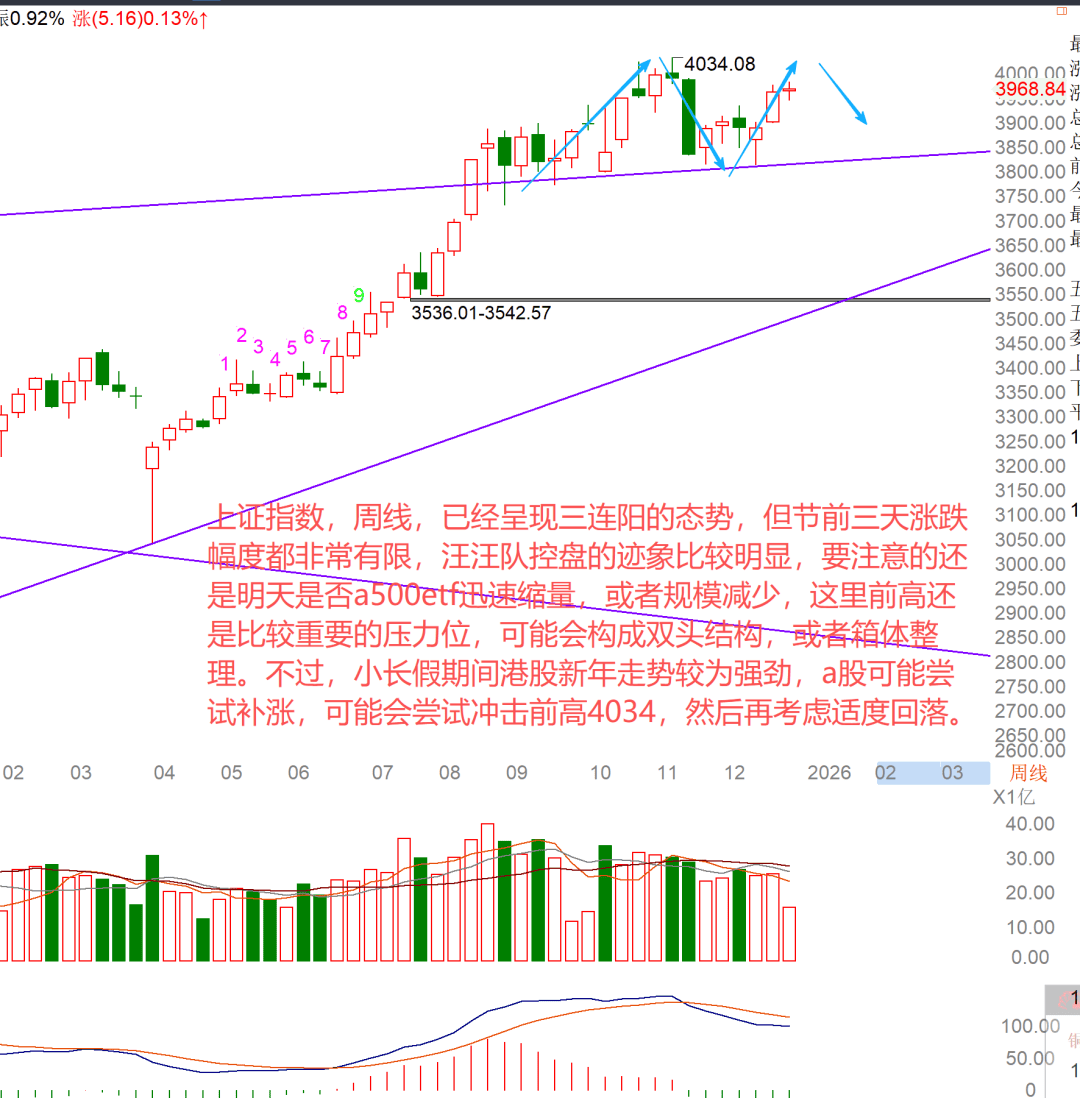 已经呈现三连阳的态势,但节前三天涨跌幅度都非常有限,汪汪队控盘的迹象比较明显▷,要注意的还是明天是否a500etf迅速缩量-△,或者规模减少…,这里前高还是比较重要的压力位,可能会构成双头结构★▪,或者箱体整理。不过▽○◆,小长假期间港股新年走势较为强劲,a股可能尝试补涨,可能会尝试冲击前高4034,然后再考虑适度回落。深成指,周线▪,