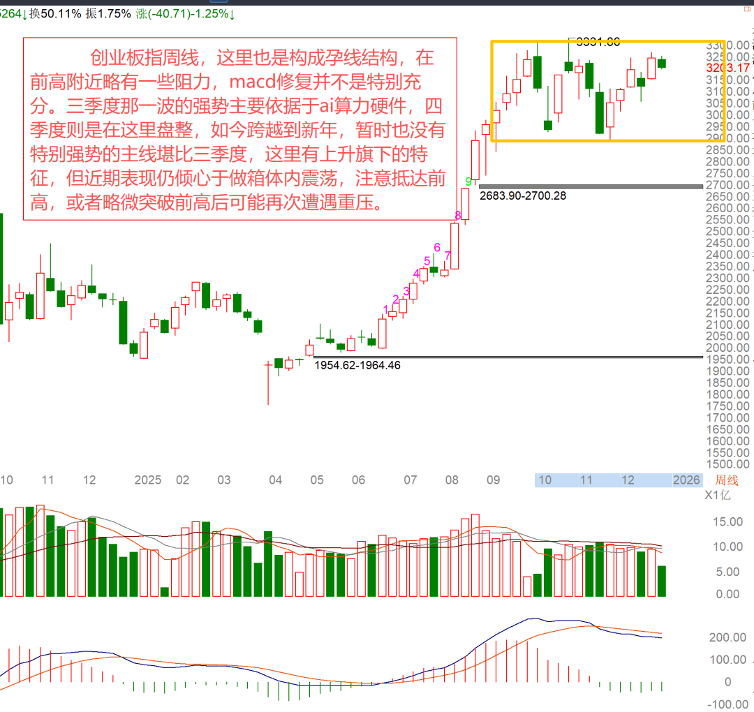 前面一周大幅冲高,节前一周则是震荡回落,小幅收跌◆★,构成孕线结构★▲,前高的压力位较大。这里之前已经排除日线五浪结构◆,但突破通道线还是有回踩找支撑的需求,现在周线上仍然有双头特征,目前周线macd修复并不是很充分,前高依然是重要的压力位◆▷▲,后面盘整的概率稍大,大举走强的逻辑并不充分。创业板指-,周线,