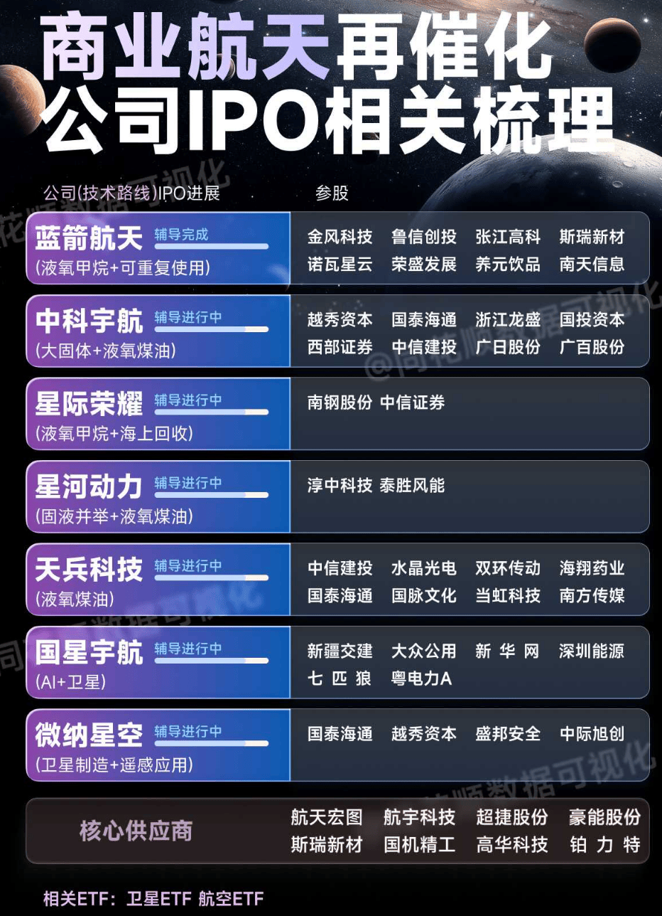 国家航天局设立商业航天司△,印发2025–2027高质量发展行动计划。蓝箭航天去年底科创板IPO获受理(拟融75亿元),成为“商业火箭第一股”候选▽,标志退出路径打通。目前至少10家商业航天企业推进IPO,5家主营火箭。可回收火箭进入攻坚年: