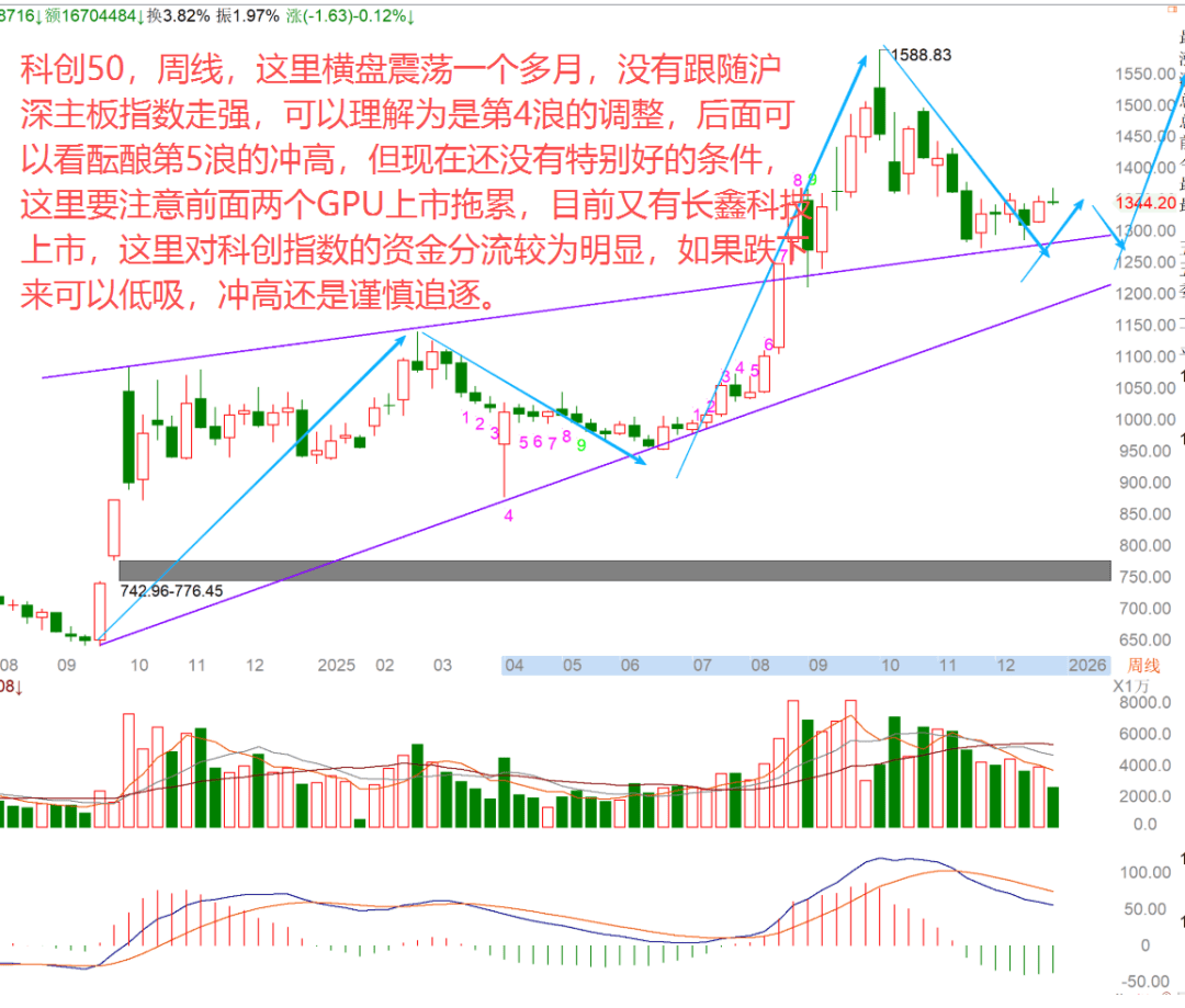 这里横盘震荡一个多月-,没有跟随沪深主板指数走强,可以理解为是第4浪的调整,后面可以看酝酿第5浪的冲高,但现在还没有特别好的条件◁…,这里要注意前面两个GPU上市拖累,目前又有长鑫科技上市,这里对科创指数的资金分流较为明显▲□,如果跌下来可以低吸☆○,冲高还是谨慎追逐。