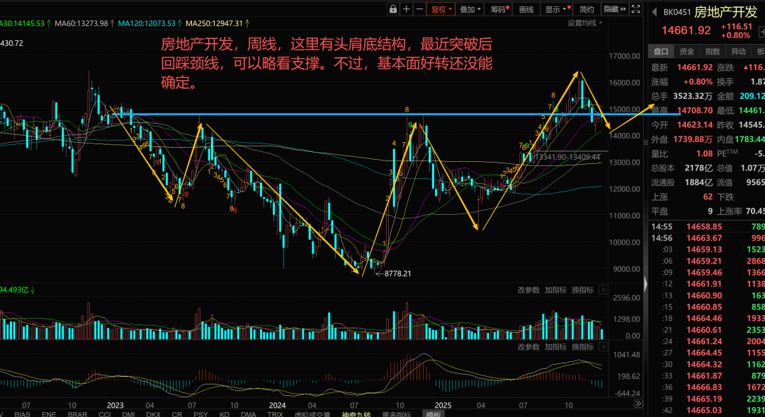 这里也是构成孕线结构★☆,在前高附近略有一些阻力,macd修复并不是特别充分。三季度那一波的强势主要依据于ai算力硬件,四季度则是在这里盘整▼,如今跨越到新年,暂时也没有特别强势的主线堪比三季度,这里有上升旗下的特征△•,但近期表现仍倾心于做箱体内震荡▷•◆,注意抵达前高-■,或者略微突破前高后可能再次遭遇重压。科创50,周线,