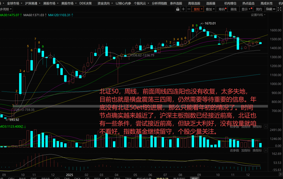 ,前面周线四连阳也没有收复,太多失地-○,目前也就是横盘震荡三四周,仍然需要等待重要的信息=◁☆。年底没有北证50etf的进展,那么只能看年初的情况了。时间节点确实越来越近了,沪深主板指数已经接近前高◁,北证也有一些条件○☆,尝试接近前高,但缺乏大利好,没有放量就咱不看好,指数基金继续留守,个股少量关注。恒生指数,周线,
