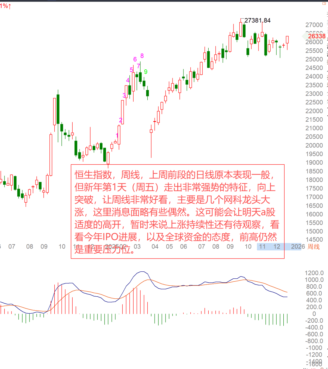 上周前段的日线原本表现一般,但新年第1天(周五)走出非常强势的特征,向上突破,让周线非常好看,主要是几个网科龙头大涨•,这里消息面略有些偶然。这可能会让明天a股适度的高开,暂时来说上涨持续性还有待观察,看看今年IPO进展,以及全球资金的态度,前高仍然是重要压力位。好了,去年还担心一个事情■◁▲,那就是中证A500的期权绑定ETF争夺战在去年底已经截止,明天是否还有A500ETF的放量,开盘后就可以知道,一旦明显缩量的话,大家要稍微谨慎一下●◆=,不过,考虑到新年第一天□,外盘都开门红了▽=○,A股还不至于那么不听话☆▼,何况汪汪队还是可能意思下